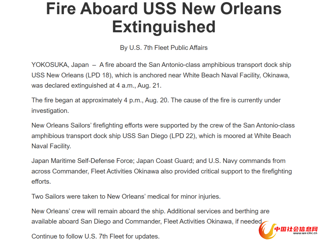 根据美军21日发表的最新声明,“新奥尔良”号上的船员将继续留在船上,火灾的具体原因仍在调查中。