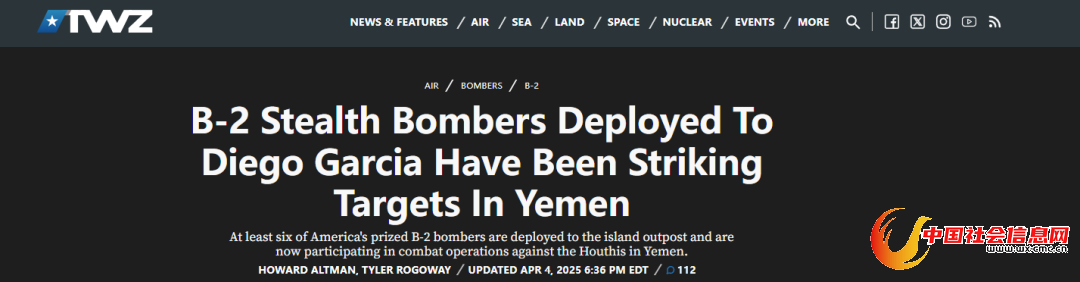 据美国“动力”网站“战区”频道4日报道,一名美国官员透露,在最近空袭胡塞武装的行动中,美国空军已经出动了部署于迭戈加西亚的B-2隐形轰炸机。美国商业卫星公司“行星实验室”4月2日拍摄的最新卫星照片显示,该基地停放了至少6架B-2和6架KC-135。目前B-2是唯一能够挂载3万磅级GBU-57/B“掩体破坏者”巨型钻地炸弹的美军战机,可用于打击胡塞武装的地下网络。不过报道承认,去年美军也曾动用隐形轰炸机空袭胡塞武装,但效果不明。目前也不确认最近B-2空袭胡塞武装时是否使用了钻地炸弹。