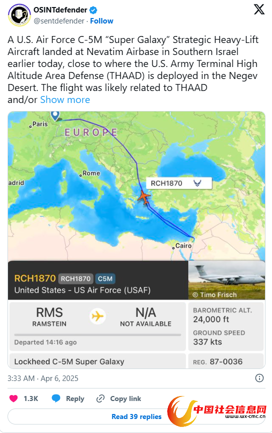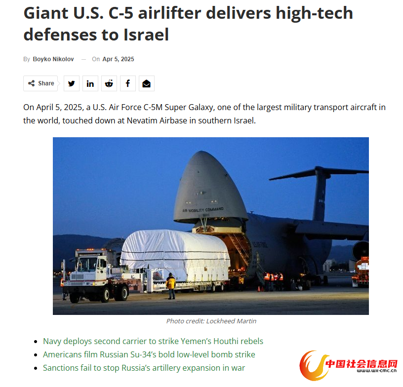 “保加利亚军事”网站称,开源情报显示,4月5日,美国空军一架C-5M“超级银河”运输机从德国拉姆施泰因空军基地出发,降落在以色列南部的内瓦蒂姆空军基地。消息人士透露,这架运输机就是执行向以色列运送“萨德”反导系统的任务。该反导系统由洛克希德·马丁公司研制,号称是“唯一可以在大气层内和大气层同时实施拦截的反导系统”,最大拦截高度达150公里。相比美军和以色列装备的其他末段反导系统,“萨德”系统的作战高度更高,并且能击落速度更快的威胁,主要针对的就是射程在1500-3000公里左右的中程弹道导弹。一套典型的“萨德”系统由移动火控和指挥控制中心、地面AN/TPY-2远程X波段雷达和最多9辆发射车组成,每辆发射车携带有8枚拦截导弹,理论上可以快速引导72枚导弹同时拦截36个来袭目标。
