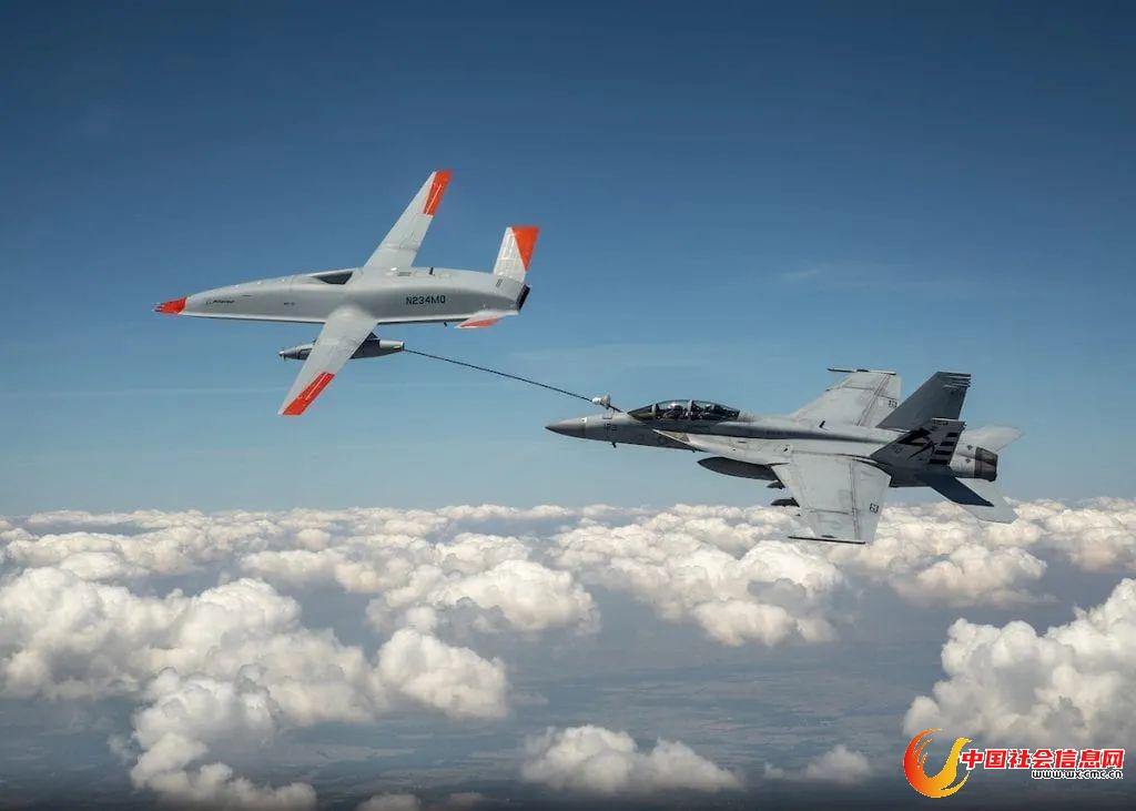 为“超级大黄蜂”战斗机加油的MQ-25无人加油机
