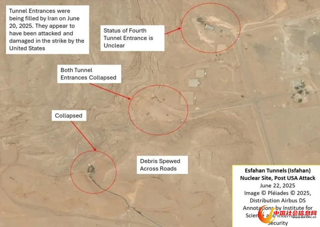 尽管美军宣称“初步作战损害评估表明,所有3个地点都遭受了极其严重的破坏”,但不少美国专家注意到,与遭到GBU-57巨型钻地炸弹攻击的福尔道与纳坦兹核设施不同,伊斯法罕核设施21日并没有美国空军的钻地炸弹落下,而是被美国海军核潜艇发射的“战斧”巡航导弹集中攻击。美国有线电视新闻网(CNN)23日称,根据空中客车公司最新拍摄的卫星照片,在美军导弹袭击之后,照片中可以看到至少18座完全或部分被摧毁的建筑物。美国智库“科学与国际安全研究所”22日发布的评估报告称,伊斯法罕核设施受到了“严重破坏”。其中用于将天然铀矿石转化为含铀化合物的主要铀转化设施“严重受损”。初步报告表明,美军导弹还袭击了伊斯法罕核设施附近的地下隧道综合体,“他们通常在那里储存浓缩铀”。
