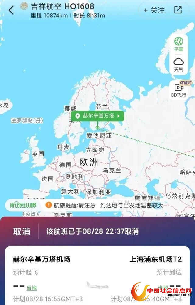 记者在航旅纵横APP上查询到,吉祥航空HO1607航班于北京时间8月28日上午10时05分从上海浦东机场起飞,当地时间28日下午13时47分抵达赫尔辛基万塔机场。而原本计划于当地时间28日16时55分从赫尔辛基万塔机场飞往浦东机场的HO1608航班,在当晚取消。
