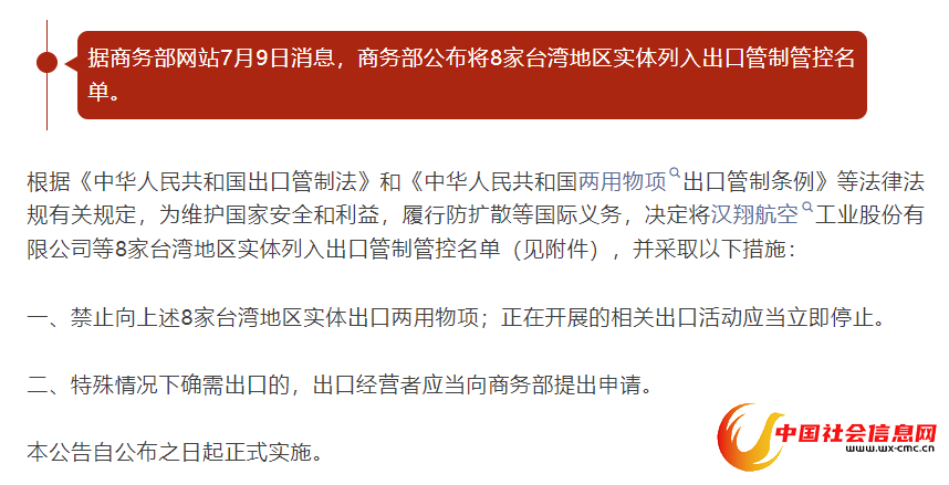 商务部宣布将8家台湾地区实体列入出口管制管控名单