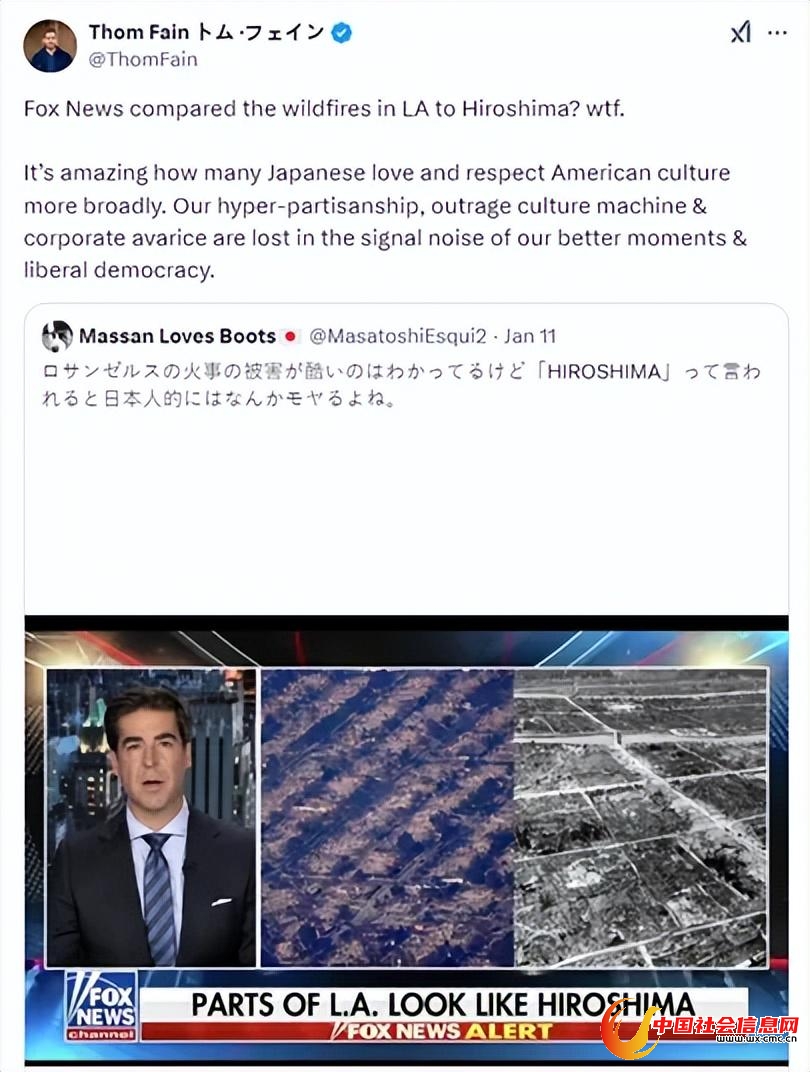 10日,美国福克斯新闻的一档节目为观众介绍洛杉矶大火,主持人杰西·沃特斯在节目中称“洛杉矶被烧毁的区域仿佛是广岛”,并附上了日本广岛在二战中被原子弹炸毁的照片。该说法发酵后,引发了大量日本民众的愤怒。