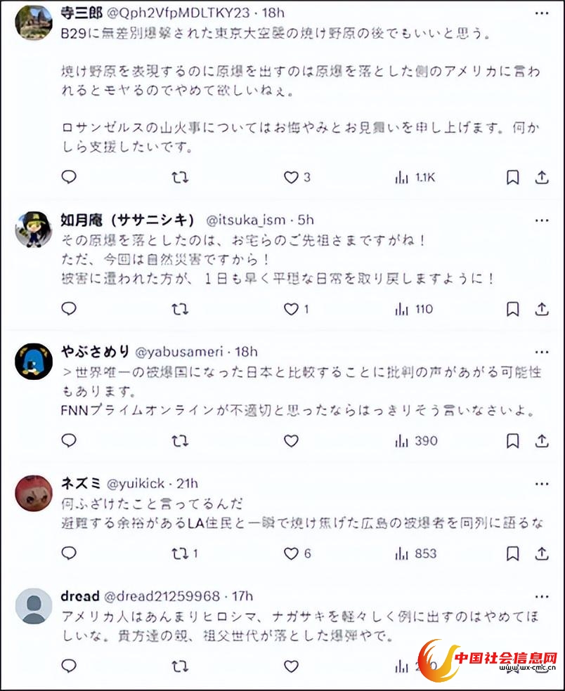许多日本网民也称自己无法接受杰西·沃特斯的言论,不少日本网民强调,“袭击广岛的原子弹就是今天美国人的祖先扔下的”,和导致洛杉矶山火的原因完全不同。