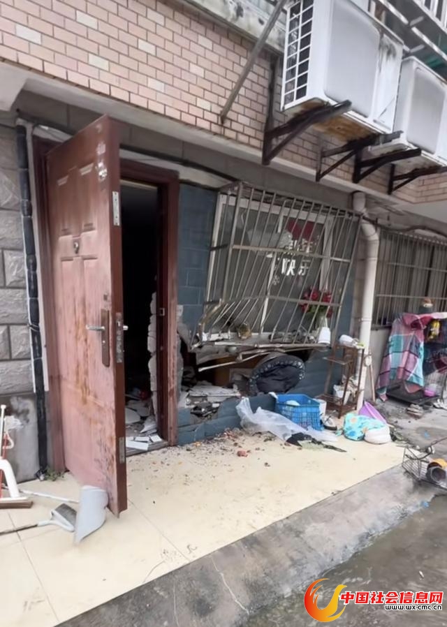 外墙被撞出一个大洞,防盗窗被撞变形,各种物品散落一地,一片狼藉。肇事车辆受损。