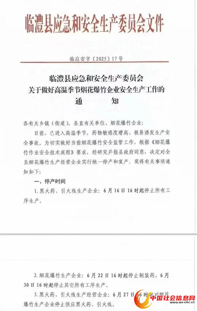 该通知要求,黑火药、引火线生产企业6月16日16时停止所有工序生产;烟花爆竹生产企业6月22日16时停止制装药,6月30日16时起停止其它所有工序生产。