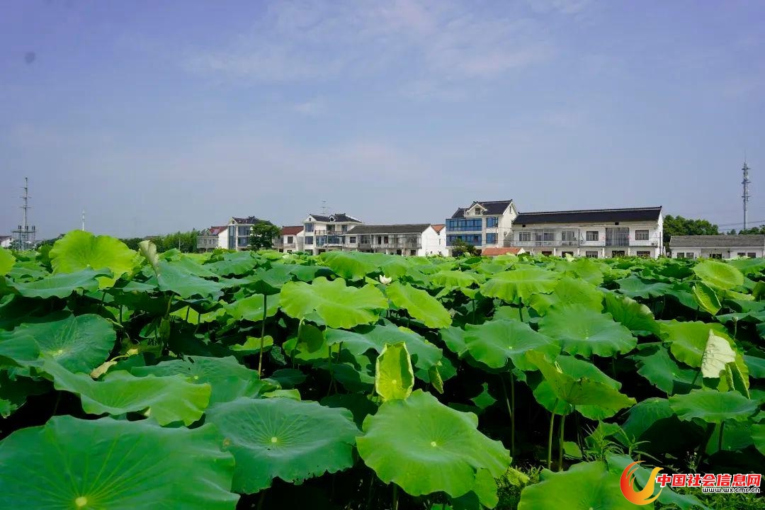 成片的荷塘和岸上的房屋相互映衬,成就一幅浓墨重彩的江南水乡画卷。