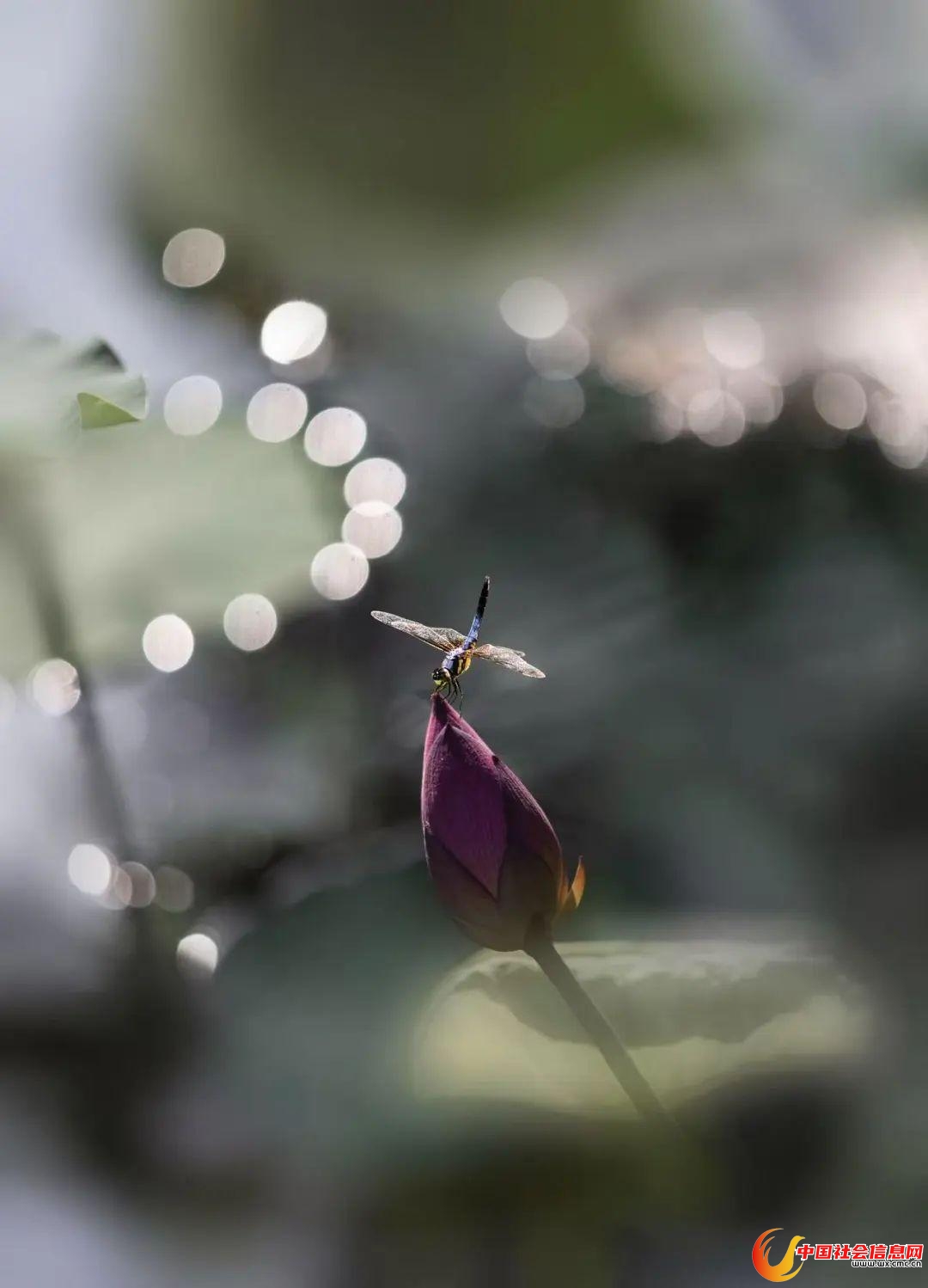 蜻蜓时而在水面上低飞掠过,时而俏皮地停驻在待放的花苞尖上,还有水鸟迈着优雅的步子,在浅水区和荷叶间逡巡,为这幅宁静的夏日荷塘图增添灵动的气息~