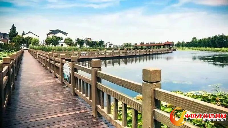 成片的荷塘和岸上的房屋相互映衬,成就一幅浓墨重彩的江南水乡画卷。