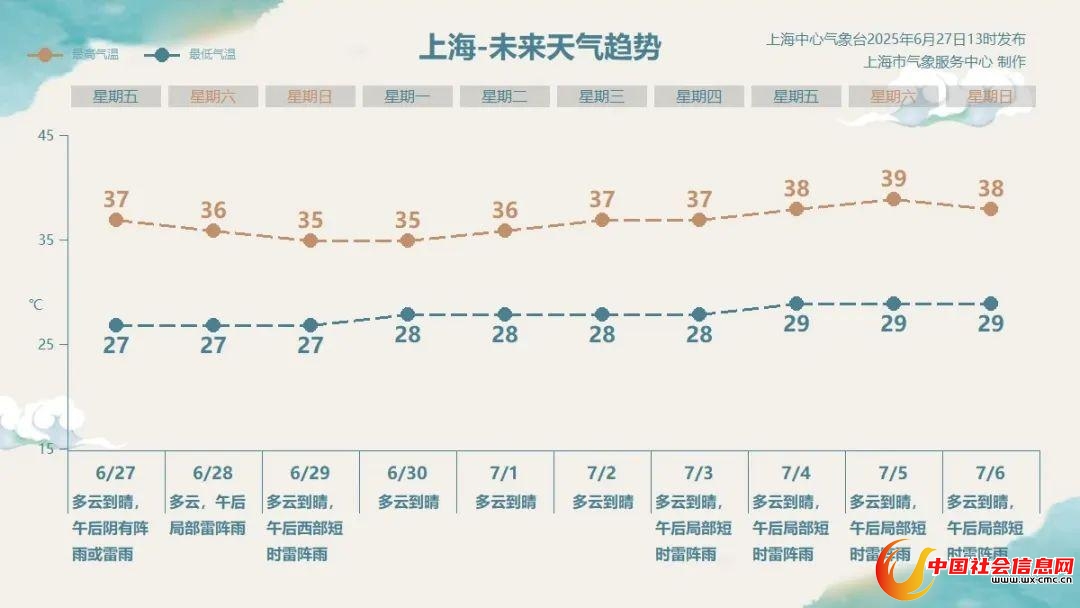 今天(6月27日)申城以多云为主,热力再度升级,最高气温突破37℃,最低27℃,相对湿度95%~55%,南到西南风3~4级。