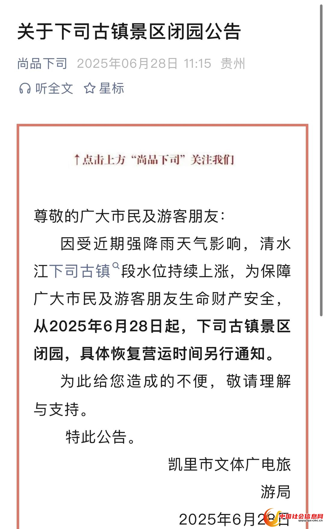 ▲下司古镇景区闭园公告