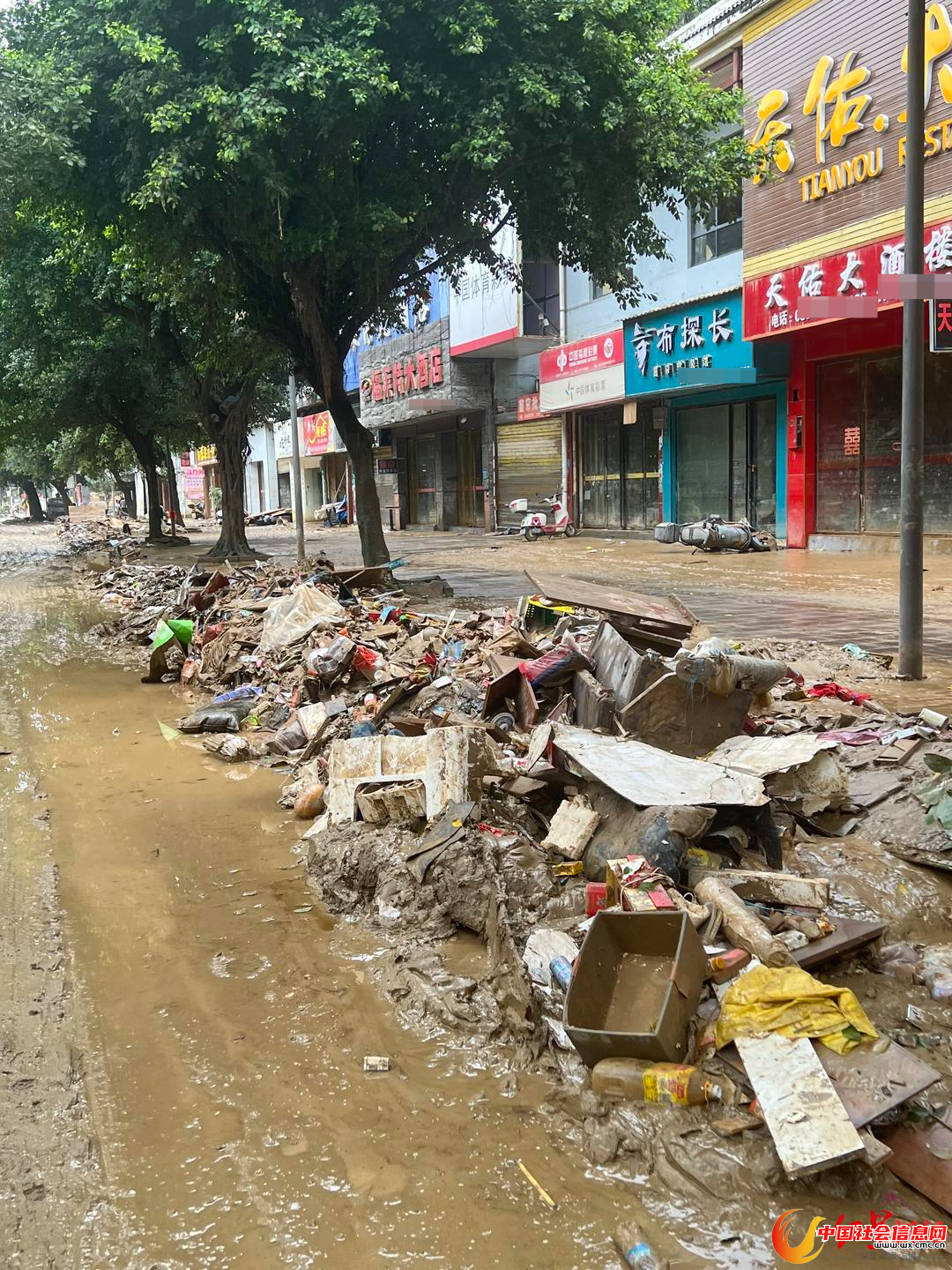 路边有一些被洪水淹没过的车辆,临街门店清晰地留着被洪水侵袭过的水位线和点点淤泥,清理出来的垃圾还堆在路边,有商户在路边进行整理,也有不少民众自发地进行着清理工作。