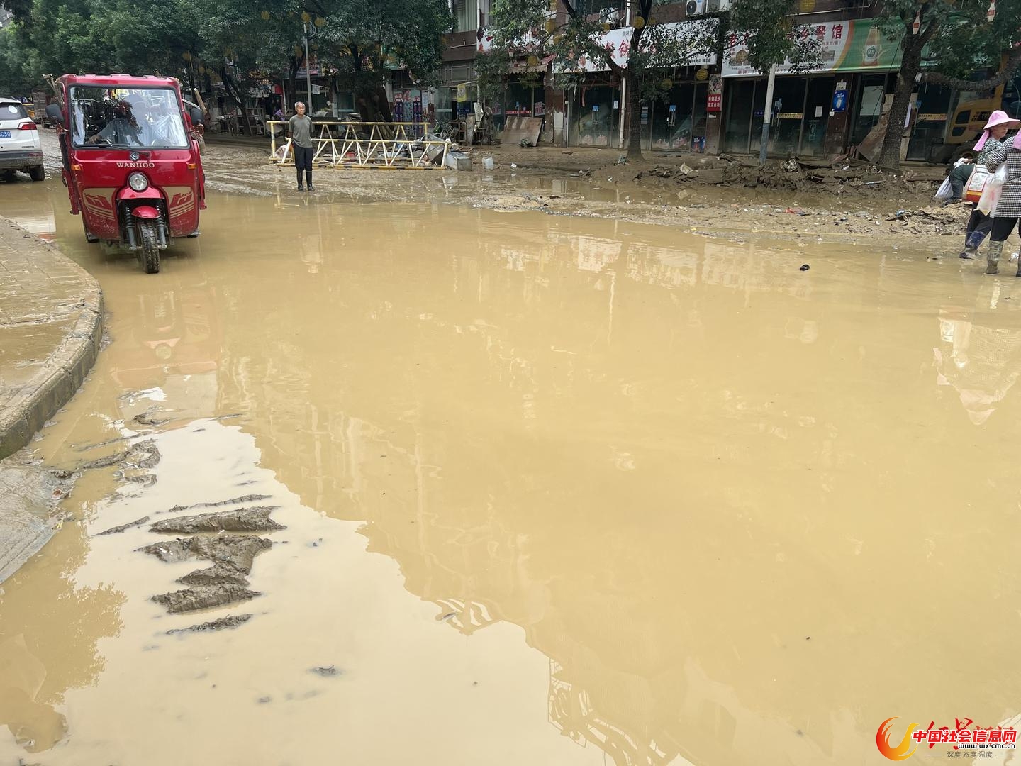 越往县城中心方向走,被洪水侵袭过的痕迹就越严重,空气中的味道变得难闻,道路上的淤泥和积水越来越多,行进也越发困难,路口有警方设立的卡哨,只允许抢险车辆通行。这是6月28日第二波洪水到来后留下的,原本这里的淤泥已经被清理得差不多了。