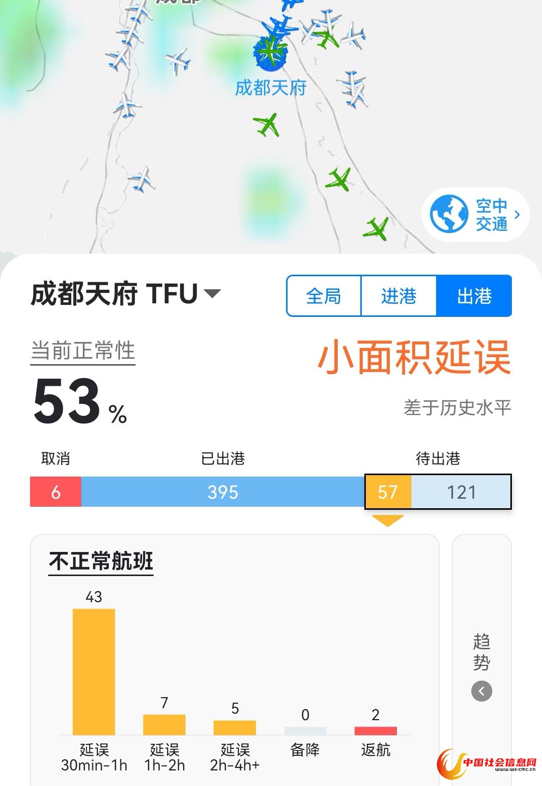 下午6时,记者查询飞常准了解到,天府机场出港正常航班比例降至53%,出现小面积航班延误情况。其中,已有2个航班出现返航,延误30分钟以上的航班量达到55班;此外,从进出港航班总量看,延误航班量已经达到68班。