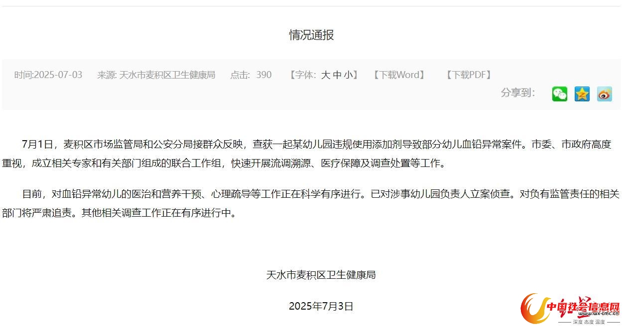 7月3日,甘肃天水市麦积区卫生健康局发布情况通报称,7月1日,麦积区市场监管局和公安分局接群众反映,查获一起某幼儿园违规使用添加剂导致部分幼儿血铅异常案件。相关专家和有关部门组成联合工作组,快速开展流调溯源、医疗保障及调查处置等工作。