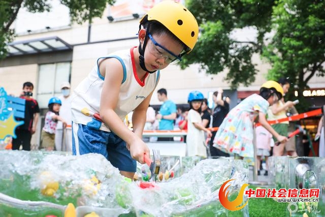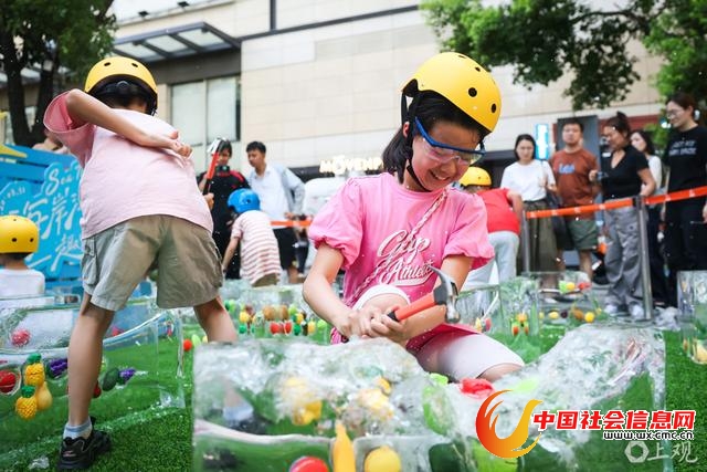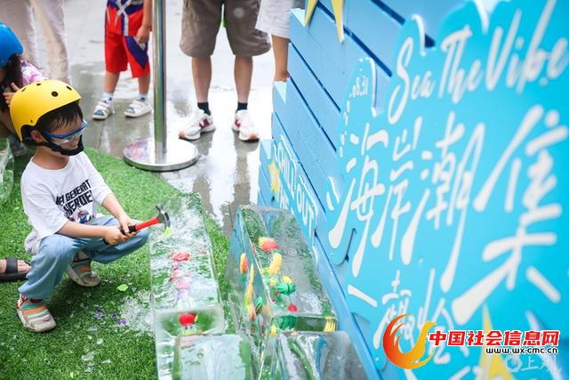 当天,商场内的“wave好海森”夏日游乐场主题活动如火如荼,小朋友们在“海岸潮集”市集体验“清凉凿冰”,在巨型冰块装置中寻宝“时令鲜果”,感受甜蜜冰爽。
