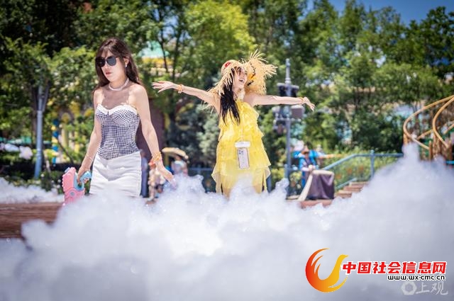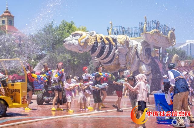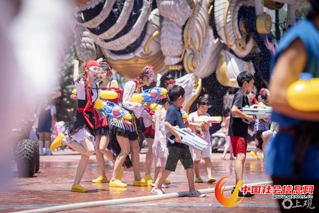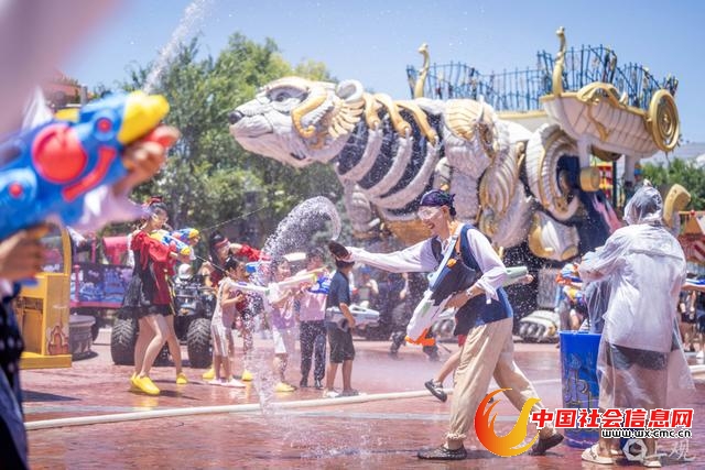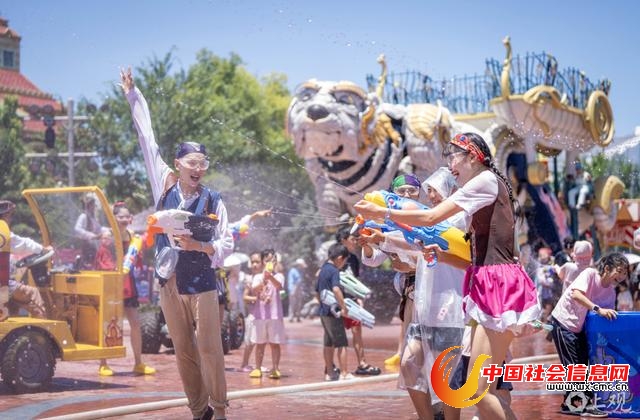 中午时分,游客们在极地小镇享受园内组织的泼水活动,欢笑声与水花交织,尽享戏水狂欢。