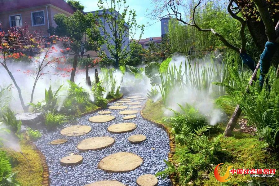 公园里,玉兰花瓣造型的廊架现代简约。白玉兰、红玉兰、紫玉兰的图片镶嵌其中。沿小路往里走,云雾缭绕,仙气飘飘。原来这是特为耐阴花境制作的雾森系统。多种耐阴植物排列组合,其中一种叶子巨大,酷似大象耳朵,它叫象耳芋,叶子直径足足五六十公分。炎炎夏日,雾森系统每10分钟“吞云吐雾”一次,每次约10分钟,一方面改变植物生境,另一方面增加湿度和负氧离子。