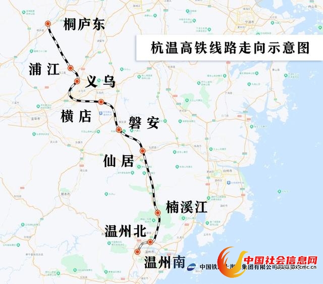 2024年9月6日,杭州至义乌至温州高铁(简称“杭温高铁”)正式开通运营。这条高铁自杭州市桐庐东站引出,途经金华市、台州市、温州市,引入温州北站,通过既有杭深铁路延伸至温州南站,正线全长276公里,设计时速350公里,全线设桐庐东、浦江、义乌、横店、磐安、仙居、楠溪江、温州北、温州南等9座车站。