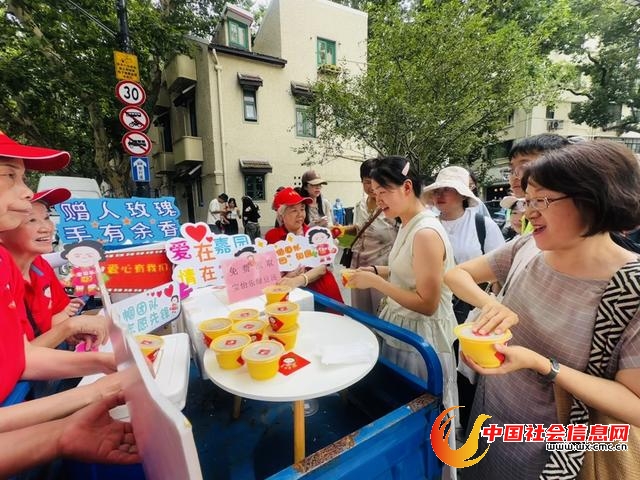 其中不乏大老远赶来的老居民。潘正玉曾在附近住了60年,经置换搬迁去了银都路。今天清早,为了帮衬着送清凉,她早上5点不到就起了,路上倒两辆公交车,花上1个半小时,赶在摆摊前到了。潘阿姨心里有衡量,觉得值:“人搬走了,但感情放不下。就当回去看看老街坊邻居。”