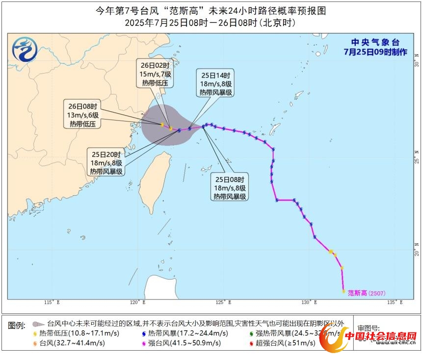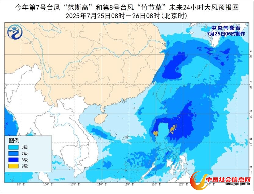 大风预报:7月25日08时至26日08时,受“范斯高”和“竹节草”的共同影响,东海大部、台湾海峡、台湾以东洋面、巴士海峡、南海东部和南部、杭州湾、江苏南部沿海、浙江沿海、福建沿海、台湾岛沿海将有6~8级、阵风9~10级大风。