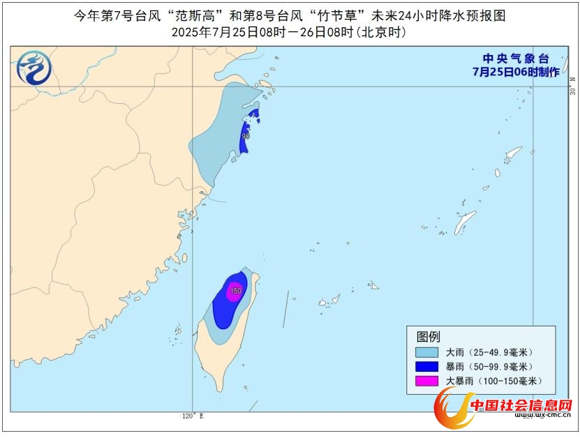 降水预报:7月25日08时至26日08时,受“范斯高”和“竹节草”的共同影响,浙江东部、台湾岛等地部分地区有大到暴雨,台湾岛北部部分地区有大暴雨(100~150毫米)。