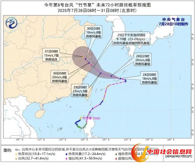 昨晚(27日),今年第8号台风“竹节草”减弱后的低压环流在琉球群岛以东洋面再度发展为台风,该续编台风中央气象台继续维持原台风名称“竹节草”和编号2508不变。今天8时,其中心位于浙江省舟山市东偏南方向约700公里的洋面上。目前“竹节草”正向西偏北方向移动,强度缓慢增强,并向浙江中北部沿海靠近,预计明天(29日)下午到夜间在上述沿海登陆,也不排除在浙江近海北转的可能性。