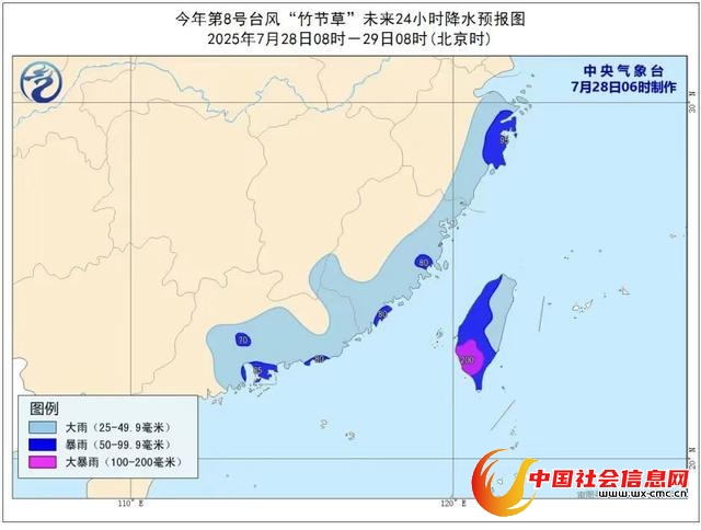 降水预报:7月28日08时至29日08时,台湾岛、浙江东部等地的部分地区有大到暴雨,其中台湾岛西部等地的局部地区有大暴雨(100至200毫米);福建东部和南部、广东大部、江西南部、湖南南部等地的部分地区有分散性大雨或暴雨。