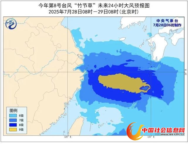 大风预报:7月28日08时至29日08时,东海大部、台湾以东洋面、杭州湾、长江口区、上海沿海、江苏南部沿海、浙江沿海将有7至8级、阵风9至10级的大风;台风中心经过的部分海区风力可达9级、阵风10至11级。