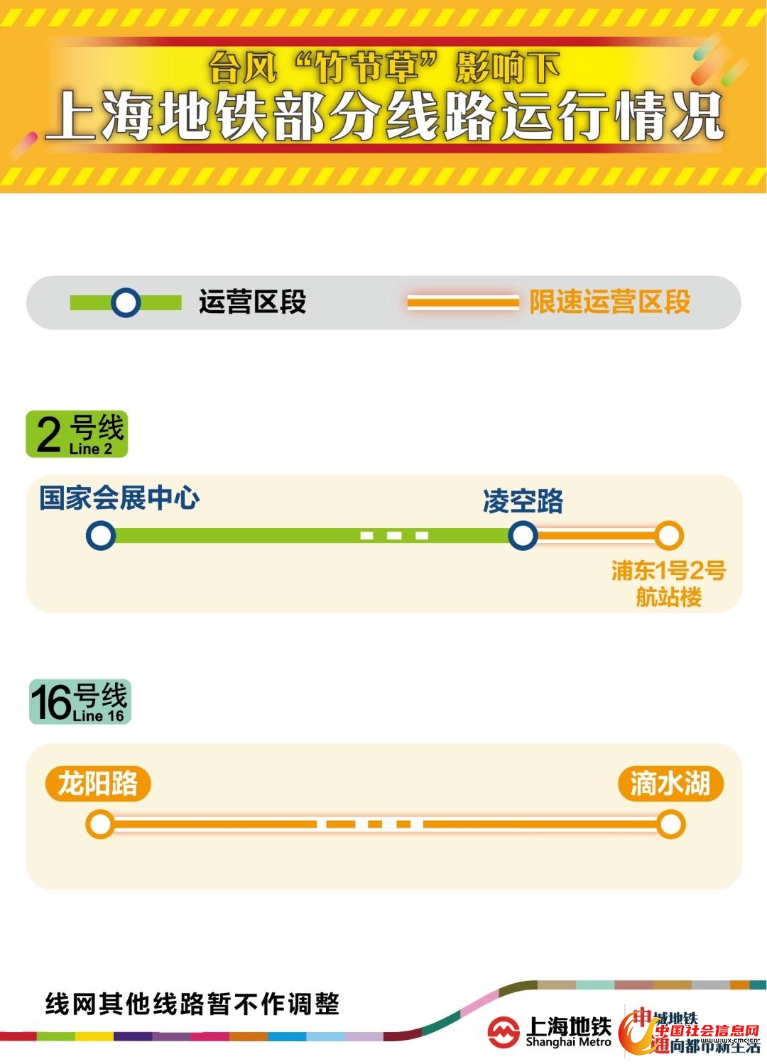 受台风“竹节草”影响,为确保轨道交通运营安全,今日(7月30日)12时30分起,【2号线浦东1号2号航站楼站至凌空路站】,以及【16号线全线】列车限速运行,提醒乘客注意!