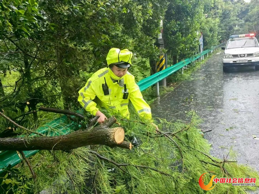 7月30日清晨,奉贤交管支队民警对路面倒伏树木清理处置,恢复交通顺畅