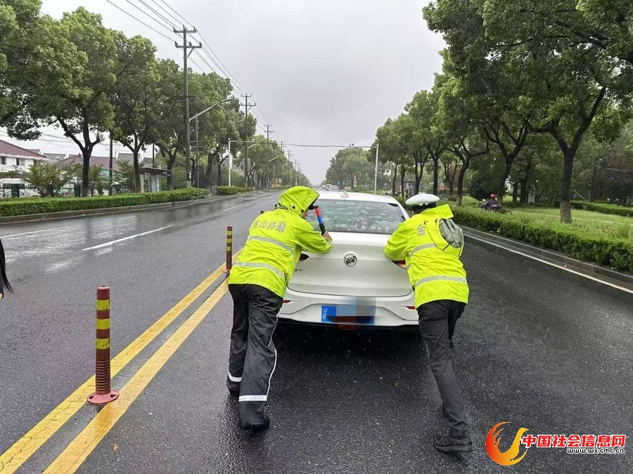 金山分局交管支队辅警帮助驾驶员将抛锚车辆推行至安全区域