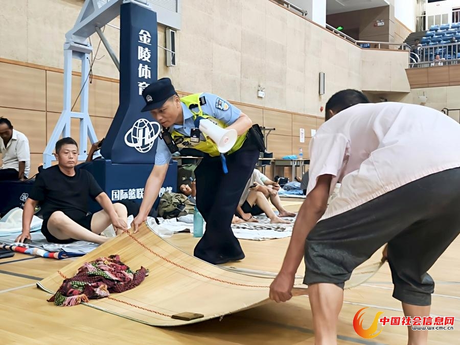 奉贤分局江海派出所社区民警在临时安置点维持秩序、疏导群众焦虑情绪