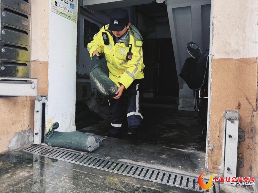 长宁分局仙霞路派出所民警为辖区低洼地带居民楼铺设沙包