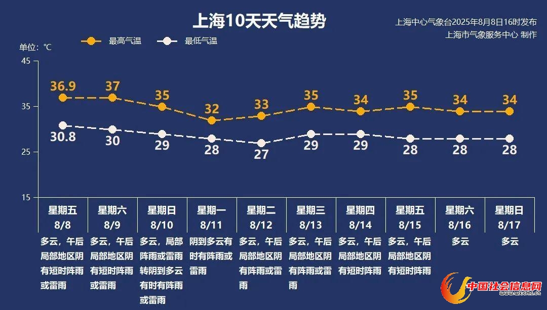 受副热带高压影响,本区今天(8月8日)全部街镇出现高温天气,闵行国家基本气象站最高温度为35.9℃,为今年第20个高温日。上海今天是多云为主的天气,早间全市最低气温在27—31℃之间。白天西南风助力气温快速上升,今天徐家汇站最高气温最终定格在了36.9℃,是近期气温的一个小高峰。由于气温高,午后崇明等地有局地对流云团发展,出现了短时雷阵雨天气。