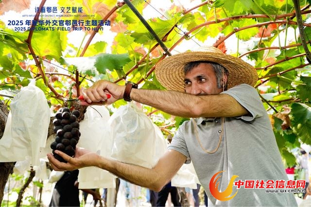 巴基斯坦伊斯兰共和国驻华科技参赞可汗·穆罕穆德正在采摘成熟的葡萄