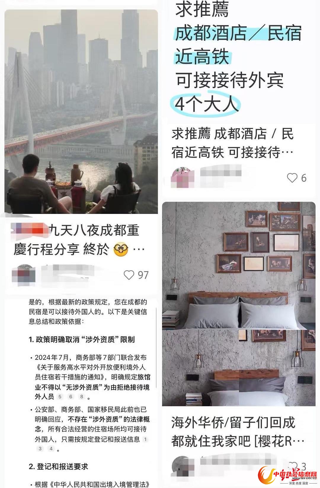 据了解,这些选择自由行的外国游客,往往首选在成都的民宿,而非成都的酒店。在小红书上,有不少关于外国人的求助帖,如“求推荐在高铁站附近的民宿,可接待外宾,共4人出行”“外国人在成都办理民宿入住需要哪些手续”……来自新加坡的Jerry是一名背包客,8月12日左右,他刚结束在贵阳的旅行,“中国的APP非常强大,在这里几乎能找到我想要的全部内容,尤其是旅行攻略。”