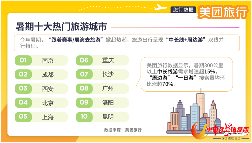 在成都,“跟着赛事/展演去旅游”掀起热潮,赛事展演有效吸引游客“多住一晚”。数据显示,暑期热门旅游城市Top10分别为:南京、成都、西安、北京、上海、重庆、长沙、广州、洛阳、昆明。