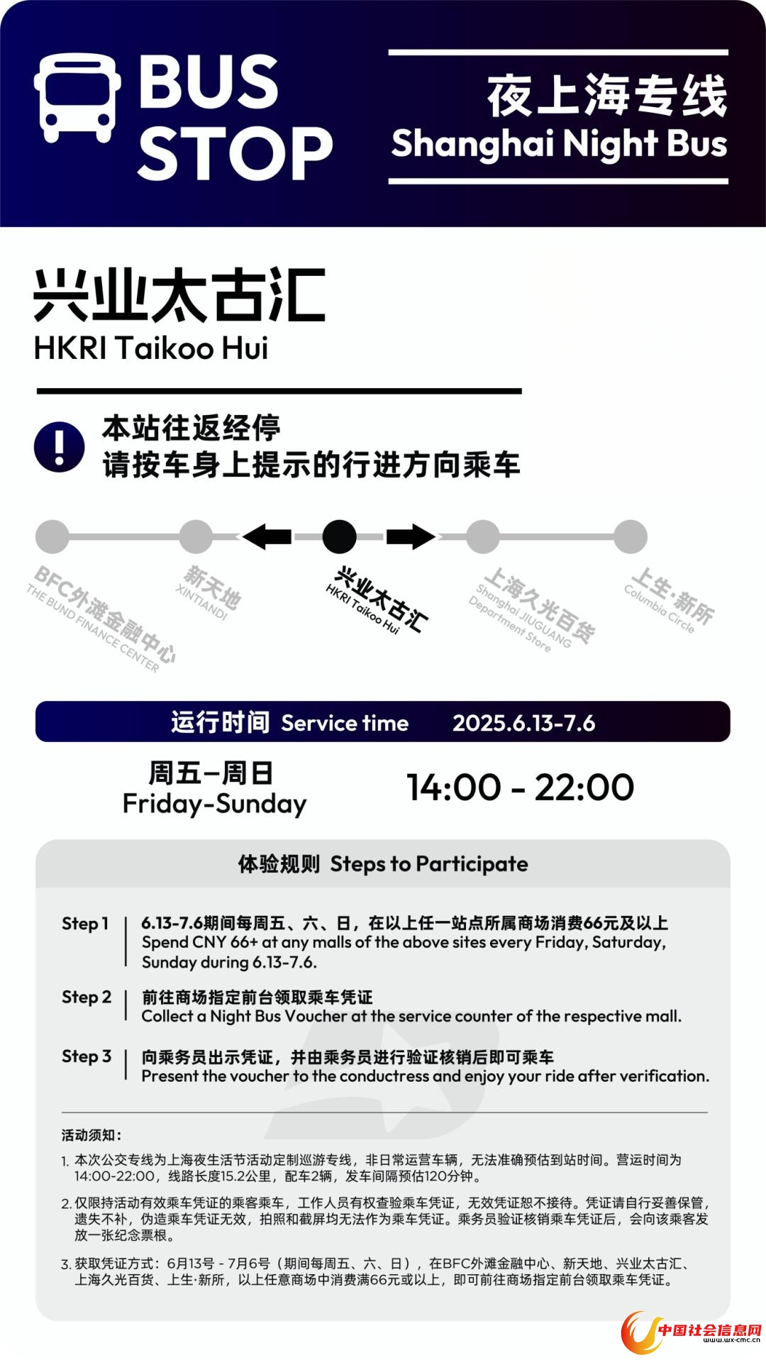 市商务委介绍,首条夜上海联动扩消费专线(简称 “夜上海公交专线”)将在6月13日至7月6日期间(每周五、六、日)运营。本次专线串联起bfc外滩金融中心、新天地、兴业太古汇、上海久光百货、上生·新所五大重点商圈,市民和在沪游客可搭乘专线畅游申城夜生活热门地标,感受“公交慢生活”的独特魅力。详见↓