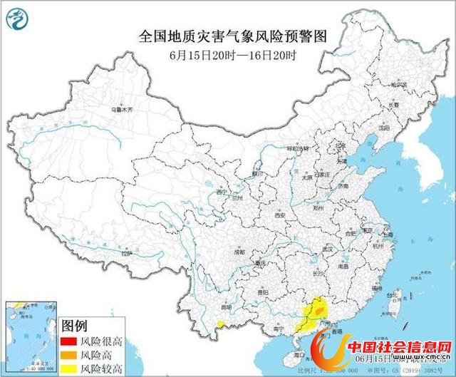 预计,6月15日20时至16日20时,湖南南部、广东中西部、广西东部、云南南部等地部分地区发生地质灾害的气象风险较高(黄色预警),其中,广东中西部等地部分地区发生地质灾害的气象风险高(橙色预警)。