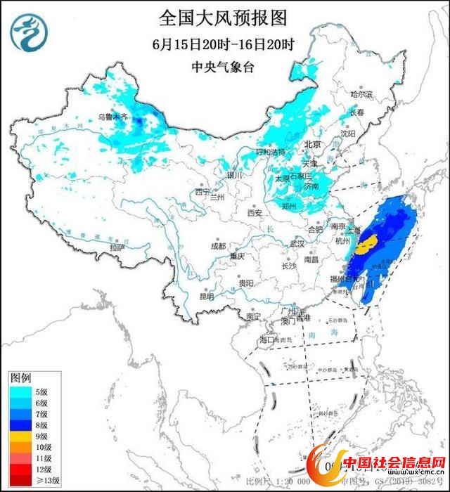 预计,6月15日20时至16日20时,新疆东部、内蒙古中东部、华北、黄淮、江淮东部以及浙江东部等地的部分地区有5~6级、阵风7~8级的大风;东海大部海域、台湾海峡、台湾以东洋面将有7~8级、阵风9~10级的大风,其中东海西部海域、浙江东部沿岸海域风力可达9级、阵风10~11级。