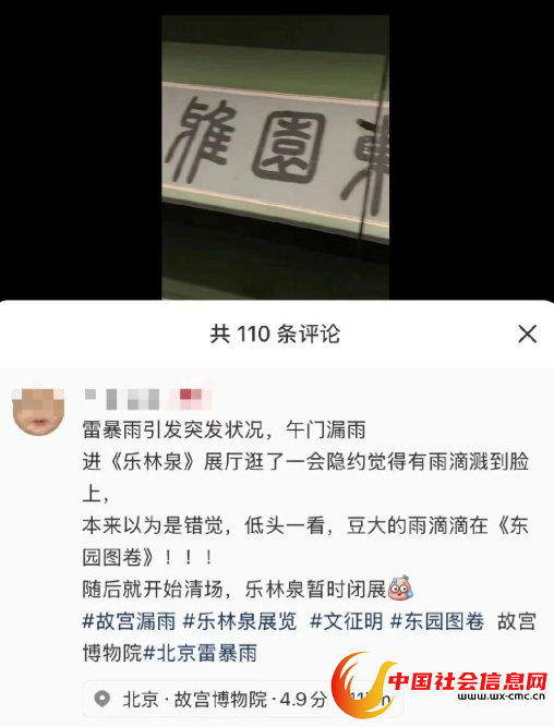 该网友发文:“雷暴雨引发突发状况,午门漏雨。进《乐林泉》展厅逛了一会隐约觉得有雨滴溅到脸上,本来以为是错觉,低头一看,豆大的雨滴滴在《东园图卷》!!!随后就开始清场,乐林泉暂时闭展。”
