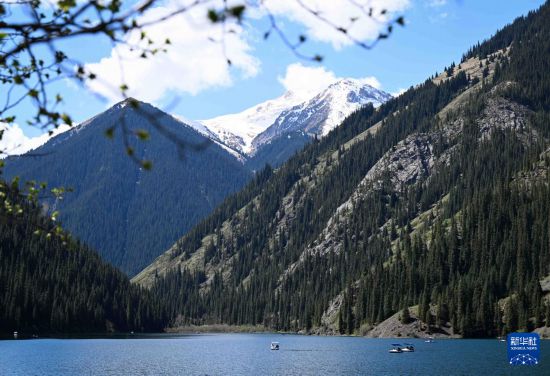 5月3日,人们在哈萨克斯坦阿拉木图州的科尔赛湖国家公园划船观光。