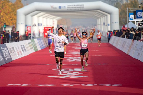 2024年11月3日,2024北京马拉松赛暨全国马拉松锦标赛(第3站)在京举行。参赛选手冲向位于奥林匹克公园的终点线。新华社记者 陈钟昊摄