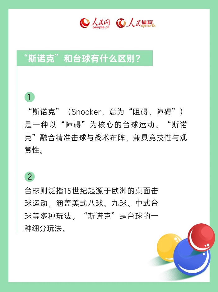 日前,中国选手赵心童在斯诺克世锦赛决赛中,以18比12战胜威尔士名将威廉姆斯,成为中国乃至亚洲首位夺得斯诺克世锦赛冠军的选手。随着他的夺冠,全国各地掀起一波斯诺克热潮。关于斯诺克运动,你知道多少?它的器材和规则是怎样的?有哪些专门术语?它和普通台球有什么区别?跟着人民体育来快速了解一下吧。