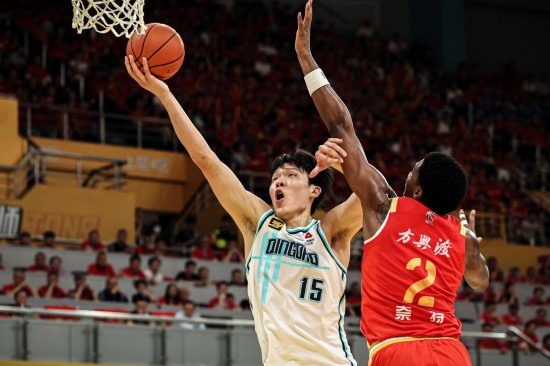 4月23日,青岛队球员杨瀚森(左)在比赛中上篮。新华社记者 江汉 摄