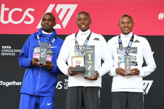 4月27日,男子精英组冠军肯尼亚选手萨巴斯蒂安·萨维(中)、亚军乌干达选手雅各布·基普利莫(左)和季军肯尼亚选手亚历山大·穆蒂索·穆尼亚奥在颁奖仪式上合影。新华社记者 贾宇辰 摄