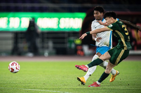 4月27日,浙江队球员王钰栋(右)在比赛中射门。新华社记者 江汉 摄