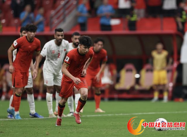 新华社照片,重庆,2025年6月10日 6月10日,中国队球员王钰栋(前)在比赛中主罚点球。 当日,在重庆举行的2026年美加墨世界杯亚洲区预选赛18强赛C组第十轮比赛中,中国队主场1比0战胜巴林队。 新华社记者 黄伟 摄